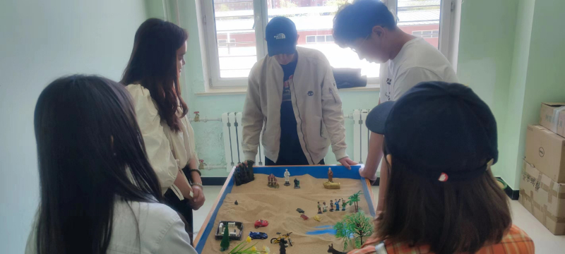 活动由学生处心理健康咨询中心刘玉婷老师主持完成。活动开始前,刘老师通过热身游戏活跃气氛。之后介绍了沙盘游戏的规则,并引导学生把双手置于沙盘中感受砂砾的美好,让每个成员与沙子建立联结,感受沙子带来的轻松、愉悦。在活动中,每一位学生用心挑选自己喜欢的沙具,根据自己的真实想法,按照自己的理解给沙盘作品赋予意义,不断将自己的小世界融入到集体世界当中,呈现出一幅他们心中的“沙盘世界”。活动最后,学生们分别为沙盘进行命名。