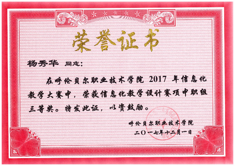 我系教师刘佳、杨秀华老师在呼伦贝尔职业技术学院2017年信息化教学大赛中,分别荣获信息化课堂教学赛项中职组、高职组二等奖;信息化教学设计赛项中职组三等奖的优异成绩。