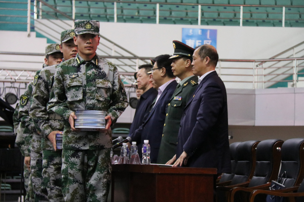 近年来,党中央、国务院、中央军委高度重视大学生征兵工作,先后出台一系列优惠政策,一大批优秀大学生参军入伍,改善了部队兵员结构,为强军兴军注入了新鲜血液。根据自治区相关工作要求,为做好我院2018年度大学生征兵工作,深入开展征兵宣传教育,4月25日下午,学院在体育馆召开2018年度大学生征兵宣传动员大会。呼伦贝尔军分区副司令员余景亮、动员处处长张树宏,海拉尔区副区长萨国文、武装部政委高树法,学院党委书记王广利、党委委员、副院长张建华出席动员大会,4000余名师生参加。动员大会由学生处处长高昕主持。