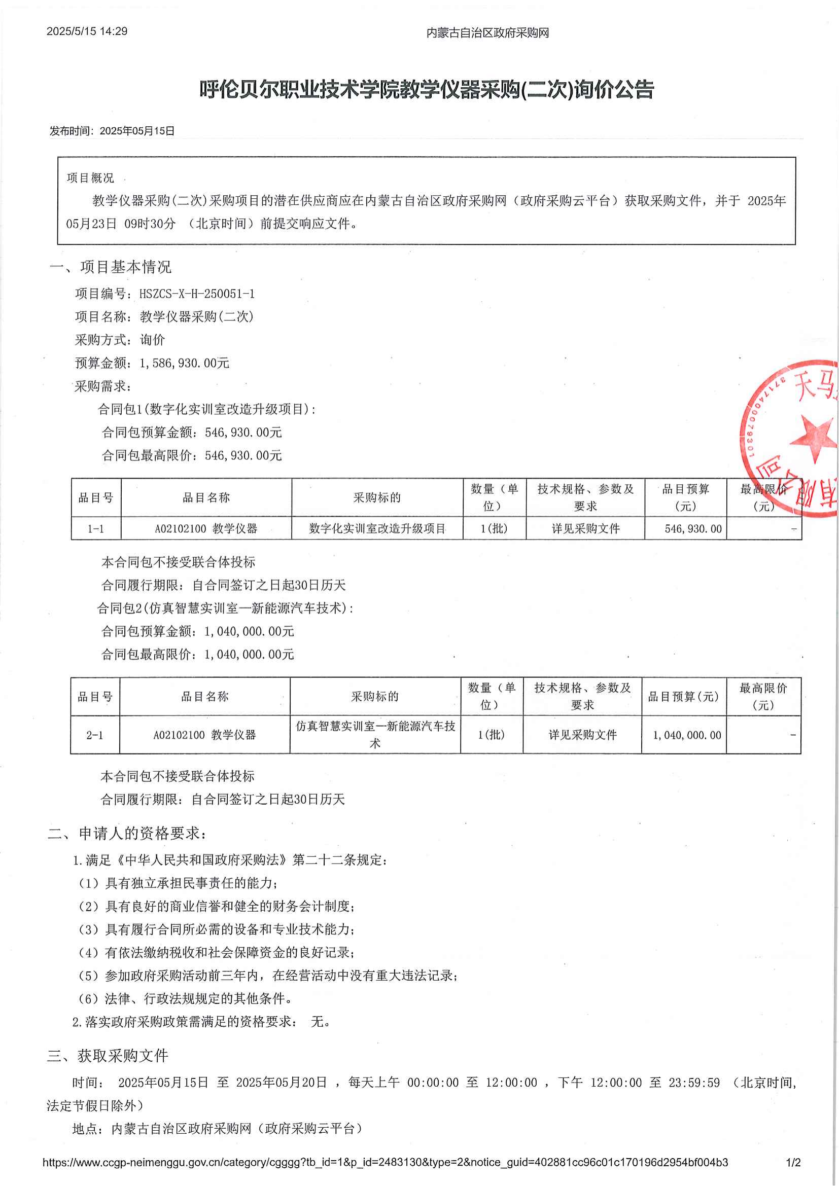 呼伦贝尔职业技术学院教学仪器采购(二次)询价公告