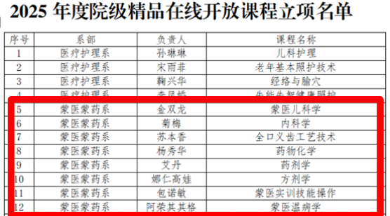 近日,学院2025年度院级精品在线开放课程立项名单正式公布,蒙医蒙药系8门课程凭借扎实的建设基础、鲜明的专业特色和清晰的建设规划成功入选,这是系部在教育教学数字化转型与优质教学资源建设道路上取得的又一丰硕成果!